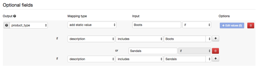 Bem, isto é muito simples. Adicione o campo opcional product_type no seu campo de input e crie uma regra adicionando um valor estático. A seguir, “extraia” os tipos de produtos dos outros campos no seu feed. Na maior parte dos casos, você verá que os detalhes corretos se encontram na descrição. No exemplo abaixo, você pode ver que criamos um tipo de produto – “Boots” [Botas] – especificando uma determinada regra. Faça isto para todos os seus tipos de produto e eles serão ajustados no campo de output que você acaba de criar.