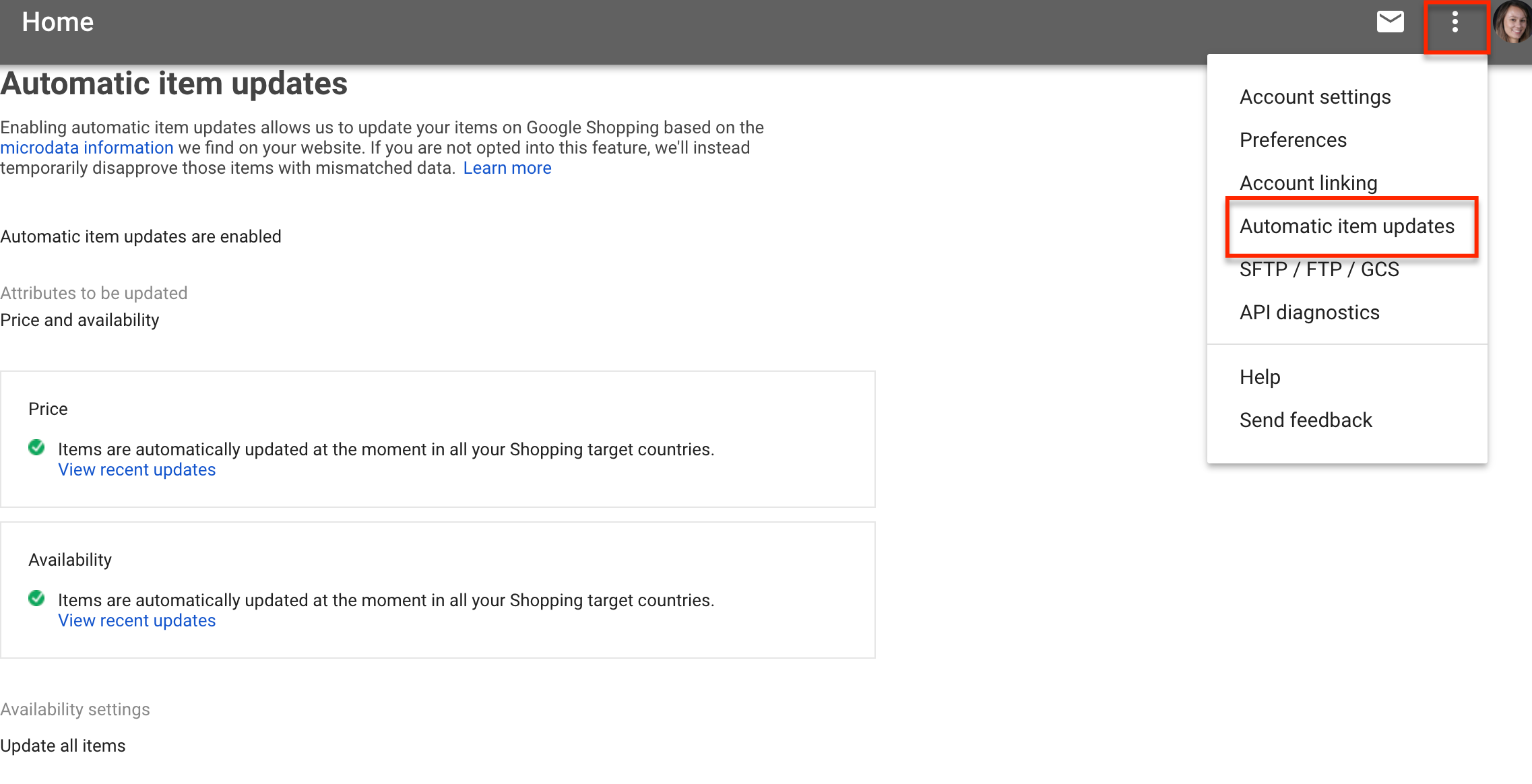 Para mudar as configurações das atualizações automáticas de dados, faça login à sua conta no Google Merchant Center e clique no ícone de três pontinhos no canto da direita no alto da tela. Isso mostrará um menu com a opção “atualizações automáticas de itens”.