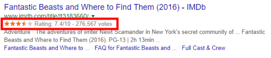 Aqui está um exemplo para um filme: o Google extraiu as informações marcadas dentro da caixa vermelha através do uso da marcação de dados estruturados no código do site.