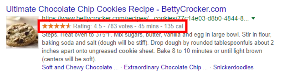 Para você, como dono de um site, o uso da marcação de dados estruturados lhe dá maior controle sobre a forma como seu site é exibido em resultados de buscas. No exemplo da receita, por exemplo, há uma classificação de estrelas e uma quantidade de votos, tempo de preparo e informações calóricas. Isso faz com que o site se destaque na página de resultados, e pode encorajar usuários a clicar.
