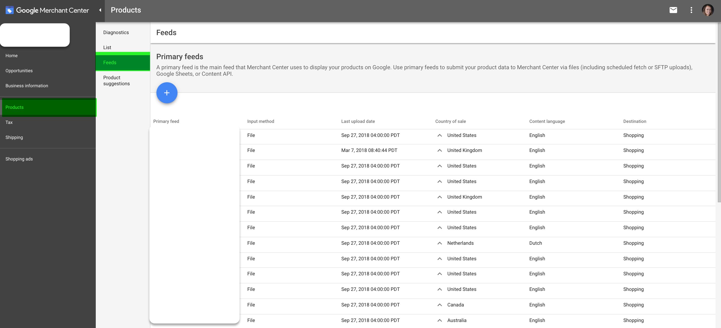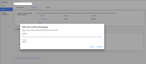 1. No seu Merchant Center, vá para a aba de feeds e selecione o feed que você quer usar em outros países.