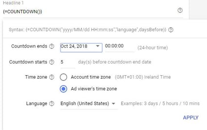 Você pode fazer isso diretamente na plataforma do Google Ads. Basta inserir um { no texto do anúncio e uma janela pop-up será aberta. A partir daí, você poderá definir as opções de contagem regressiva.