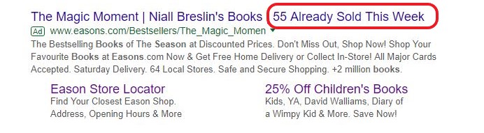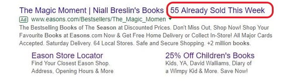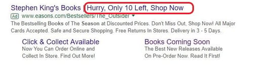 Para criar um senso de urgência ainda mais forte nos consumidores e maximizar a receita nos poucos dias de venda, você pode destacar nos anúncios de texto o nível de estoque restante.
