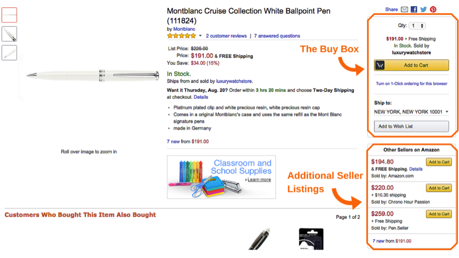 A Amazon usa um algoritmo para decidir qual vendedor ganha a Buy Box. Quando um cliente clica e completa a compra, será este o vendedor que receberá a venda. Qualquer terceiro vendedor pode, teoricamente, chegar à Buy Box, mesmo ao competir com a Amazon ela mesma.