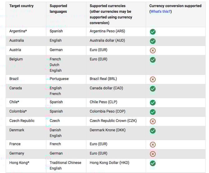 Você pode usar o conversor de moedas para dirigir anúncios de vendas para qualquer um dos países na lista, mas também é necessário atender aos requisitos de idioma para cada país. Vale lembrar também que, como as taxas de câmbio globais oscilam, a estimativa pode ser diferente do preço final, o qual dependerá das taxas de câmbio do cartão de crédito ou outra forma de pagamento do usuário.