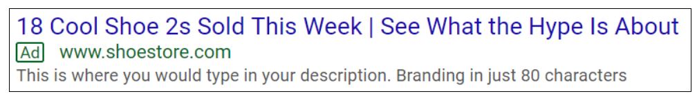 É importante estar ciente dos limites de caracteres para anúncios de texto da Rede de Pesquisa. Até o momento, setembro de 2019, anúncios de texto contêm três títulos de 30 caracteres e duas descrições de 90. Se o nome de um produto, ou os atributos do feed, forem maiores do que 30 caracteres, isto pode causar a reprovação do anúncio. É importante estar atento e certificar-se de que o texto esteja adequadamente reduzido. Isto é particularmente relevante dado que os anúncios do Google Shopping permitem títulos de 70 caracteres. Isto quer dizer que, muito frequentemente, você não pode usar o mesmo título para anúncios do Shopping e para anúncios de texto baseados no feed. Provavelmente você precisará de dois feeds independentes, ou duas versões diferentes.