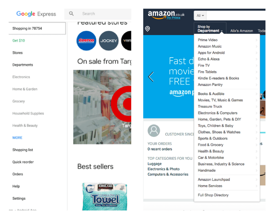 - Ambas também incorporam um uso significativo da busca de voz; o Google Express oferece produtos de uma seleção de seus varejistas no Google Home, enquanto que a Amazon oferece compras diretamente através da Alexa.