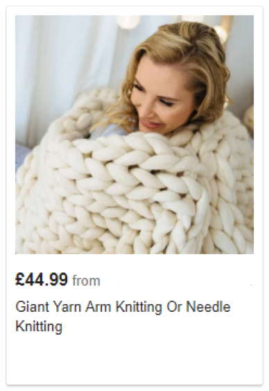 Por mais que você conheça muito bem o seu produto, você precisa ter em mente que pode ser a primeira vez que o cliente o vê. Por exemplo, o produto abaixo é um novelo de lã grossa. No entanto, isto não fica claro, já que o novelo aparece já em forma de cobertor tricotado: