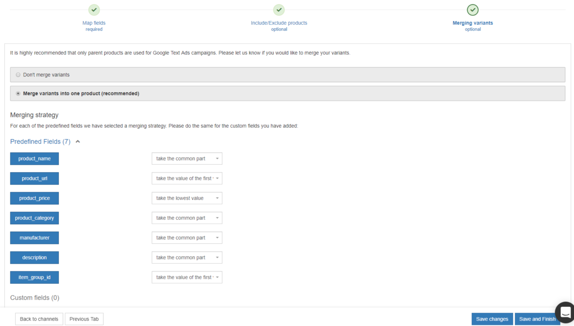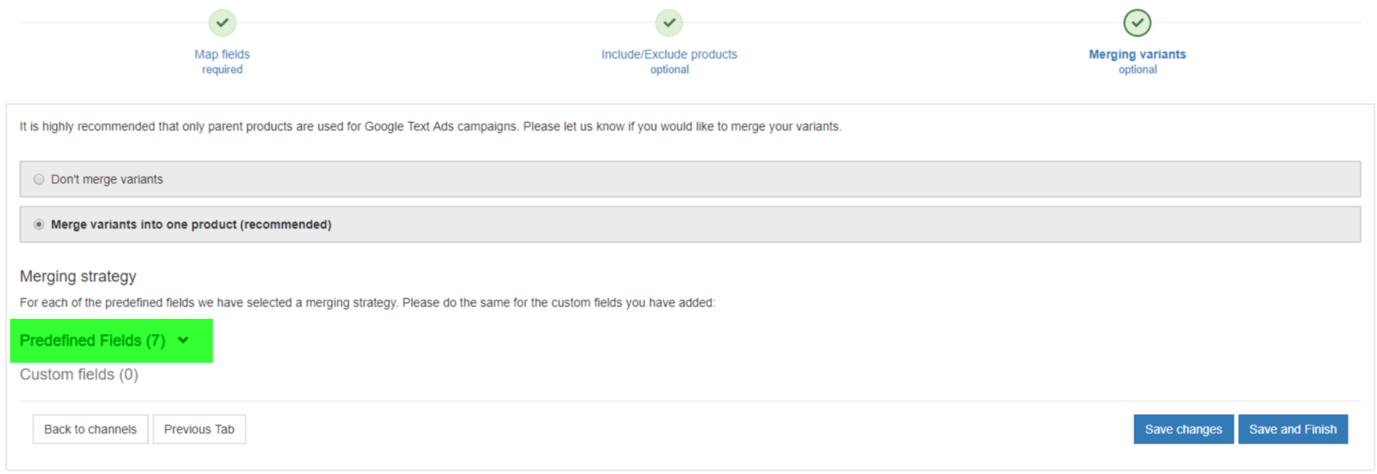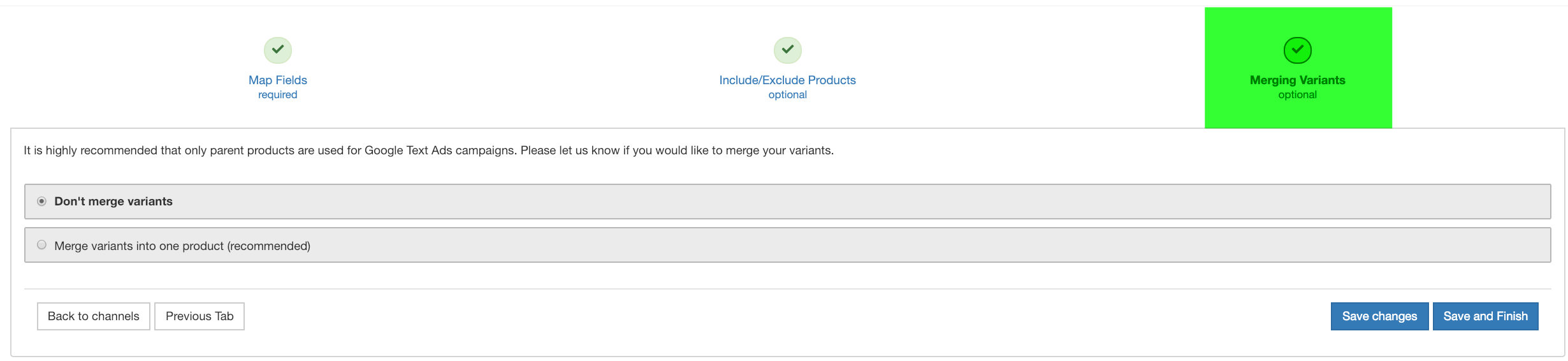 1. Vá para Editar Feed no seu feed de Anúncios de Texto e você verá uma nova Guia no seu mapeamento de feed de Anúncios de Texto: Mesclar Variantes.