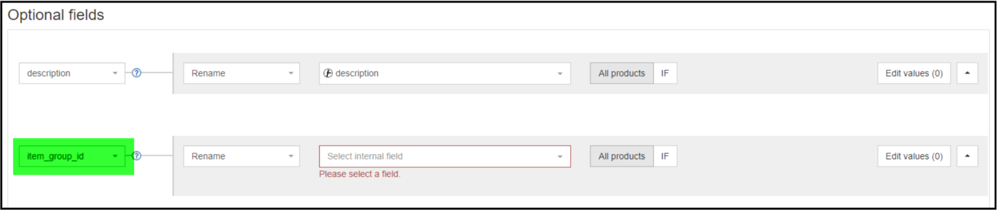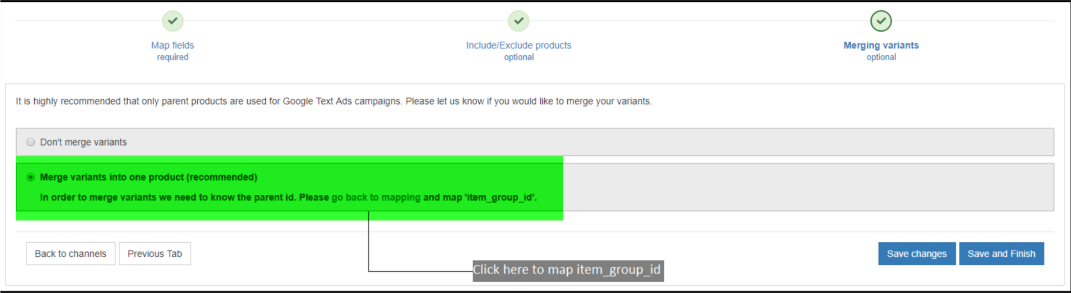 3. Mapeie o campo item_group_id [id do grupo de itens]. Clique em Salvar e continuar e você será levado para a guia Mesclar variantes novamente.