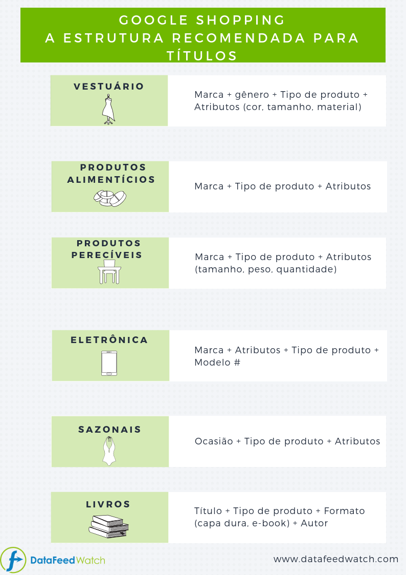 Para o Google Shopping: os algoritmos do Google procuram palavras-chave no título a fim de identificar se o produto sendo anunciado é a melhor equivalência para determinadas buscas.