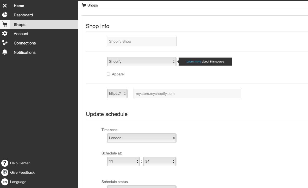 Quando chegar a altura de criar a sua loja no DataFeedWatch, adicione simplesmente o seu URL Shopify e os seus produtos serão automaticamente descarregados. Está a ter alguma dificuldade? Contacte-nos - teremos todo o prazer em ajudar!